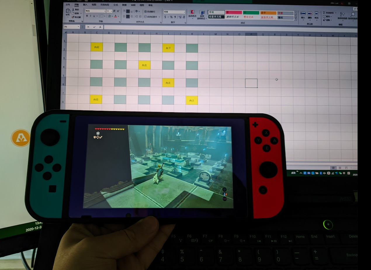 这个【阿科·瓦塔神庙】的通关条件是所有小风扇都被大风扇吹转,为了摸索破解这个神庙的通关谜题,我用Excel画了个让所有小风扇(绿色格子)转起来,那么大风扇要调整到吹的方向,成功了,如下图: