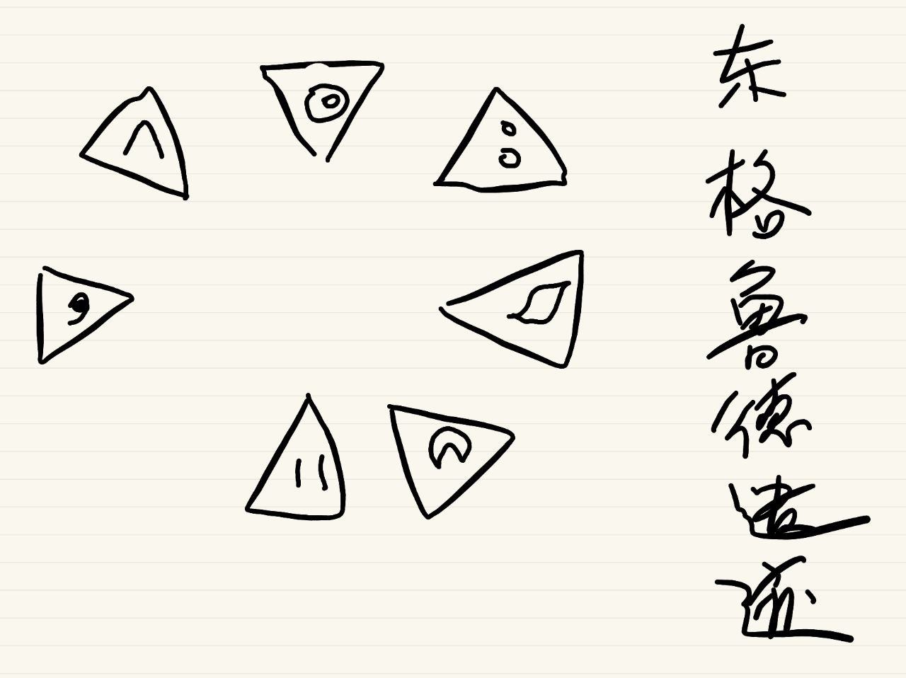 格鲁德地区东北边缘的【东格鲁德遗迹】隐藏着一个神庙挑战【七英雄】,七座围成一圈的巨大神像所需要放置的铁球的符号如下: