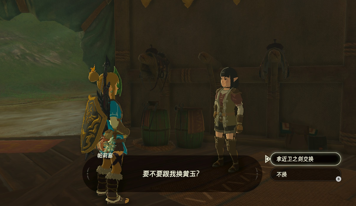 在【河畔驿站】有个NPC妹子叫【帕莉塞】,她会用宝石换你的近卫系列兵器,例如用【黄玉】买你的【近卫之剑】,这些近卫系列武器在【海拉鲁城堡】里可以收集到,建议可以每次红月后怪物和兵器重新出现时再去。