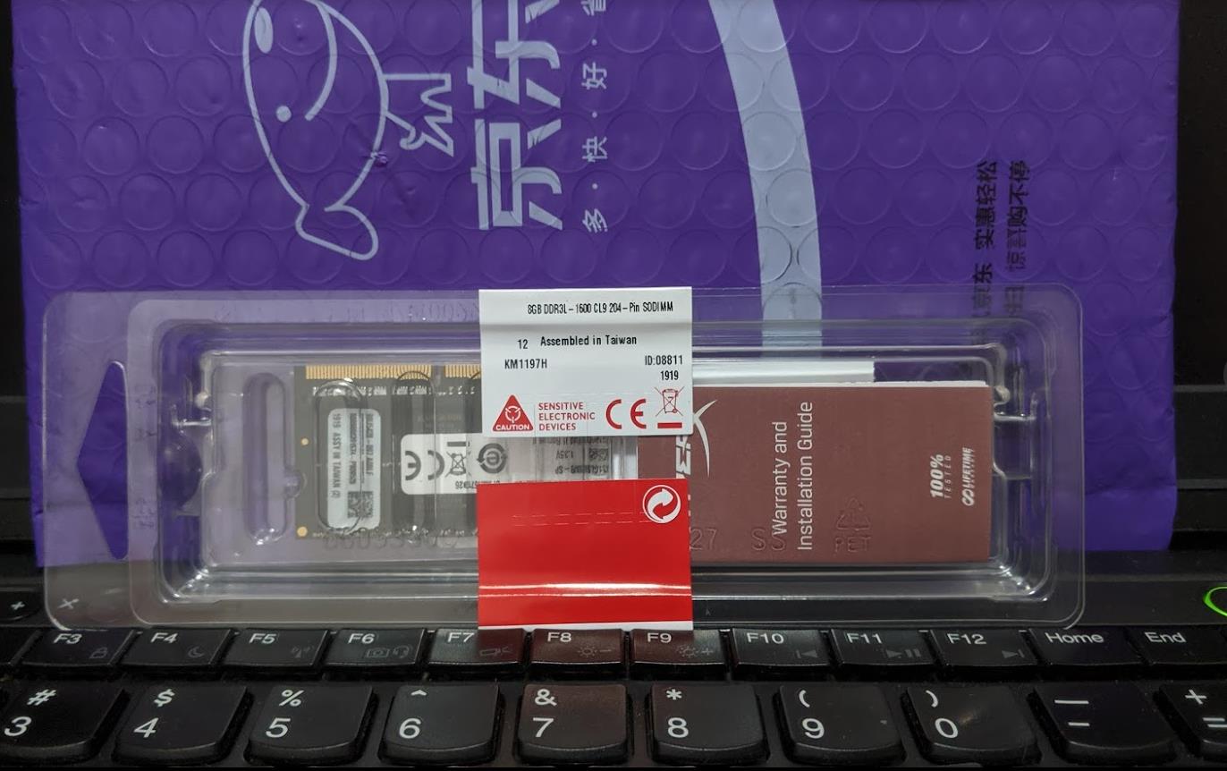 有之前给旧的笔记本换内存条发现频率不匹配的翻车经历,这次学会了先查清楚当前笔记本内存的规格和频率是DDR3L(也就是DDR3的低电压版,猜测L是Low-voltage的意思),频率1600,于是直接在狗东(京东)上搜到金士顿的两款同规格产品,价格差不多,看在黑黑酷酷的颜值份上,选了HyperX,名字叫神条,有点不明觉厉的高玩风?狗东下单,第二天到手(话说最近狗东自营的配送比较慢了,往常上午11点之前下单,当天傍晚就送达,地点深圳)。