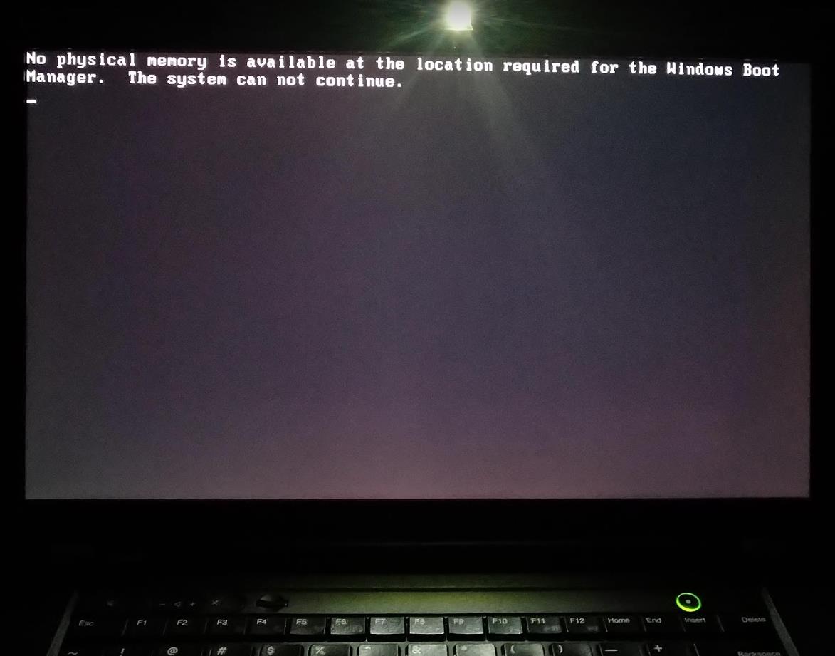 No physical memory is available at the location required for the windows boot manager. The system can not continue.
