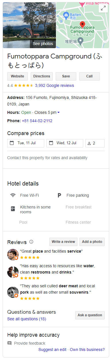 公司的名称【ふもとっぱら】翻译过来是Fumotoppara Campground,就是一家经营户外营地的公司,据Google上的资料信息,这个营地是非常知名的露营胜地,可以观赏远处的富士山景色,营地的口碑非常好,难怪那位锤友也去露营了,据说一晚才1千日元(不到50RMB),还有免费的带智能马桶的公厕,可洗漱和洗澡,对比国内的旅游场所,实在是业界良心了呢