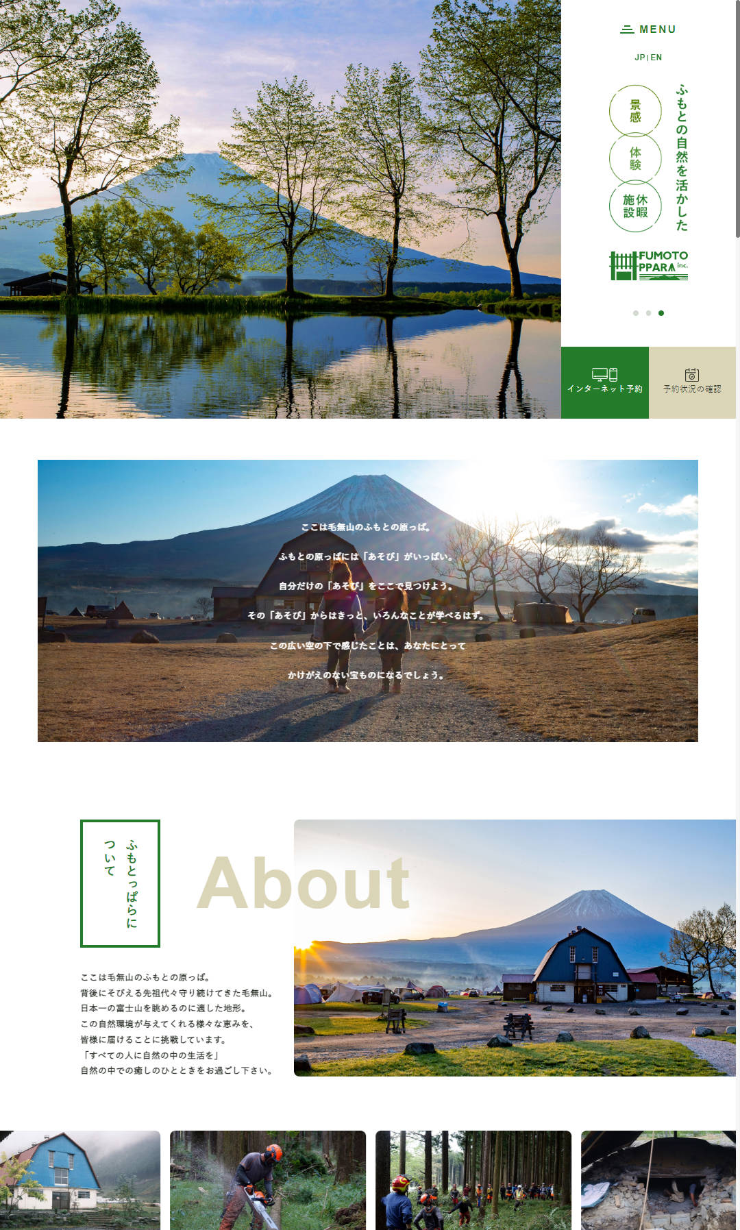 还顺带发了一个关于这个营地的网址(https://fumotoppara.net/),打开一看,风格是典型的日式清新和精致,版面简单但不落俗套,有专门的设计: