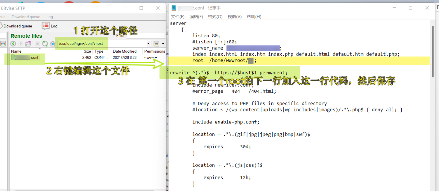 编辑步骤2中的【此处一般是你的域名】.conf,