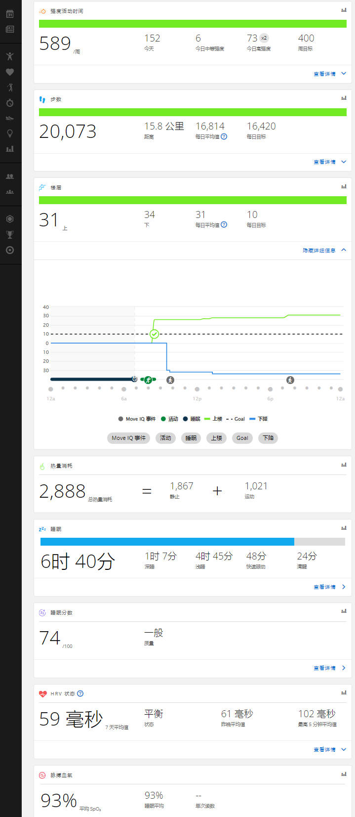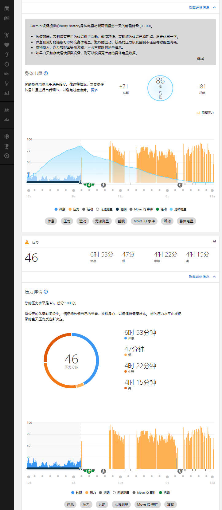 开头讲过,佳明的专业还体现在把设备记录到的用户的宝贵数据,额外以网页版形式整理分类呈现给用户,让用户可以随时查看自己从第一天使用开始,任意某天的某个时刻的一些基本健康数据,前提是当时有佩戴手表并开启记录功能,随着时间推移,健康数据变化的趋势就显得很直观,并且,记录越连贯和越持久,那么佳明给到的建议就会越合理。也就是说,如果希望以后随时能查看这些数据并且建议内容尽量准确,那么建议每天除了运动后清洁设备以及洗澡的时候摘下,其余时间都佩戴(睡眠时表带可以调整松一些)。