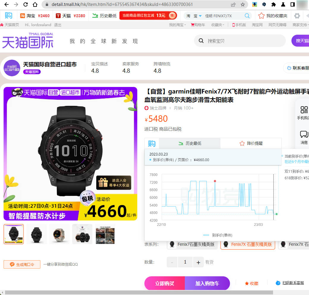 天猫国际自营进口超市的飞耐时fenix 7X:天猫自营店铺,应该还是比较可靠的