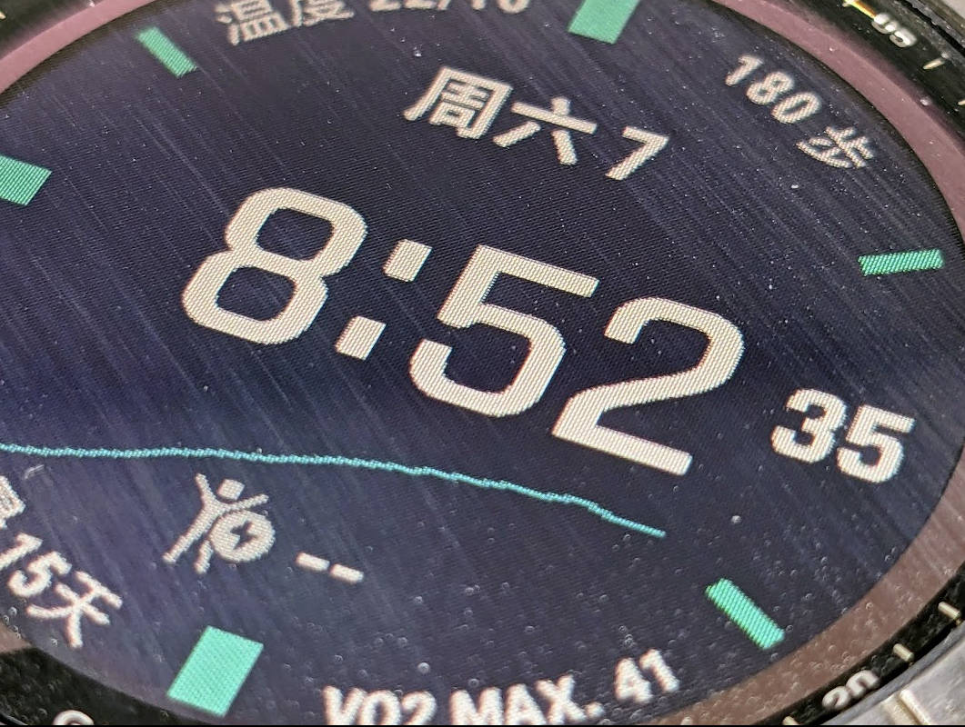 - 手表自带了一些可以自定义的表盘,也可以在官方的APP(connect IQ)里下载很多官方和第三方的表盘,尤其是官方表盘不乏优秀之作(如果想延长续航时间,建议选不会每秒变化的表盘,例如没有秒和实时心率数据的)