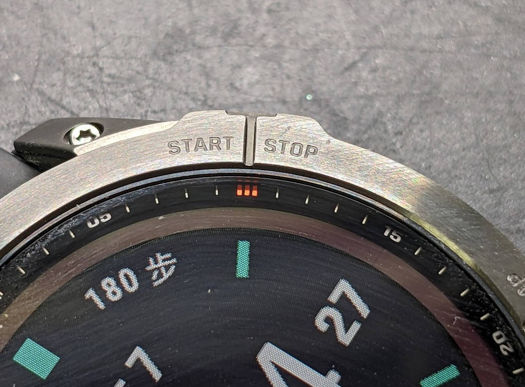 - 手表正面前方有高亮度LED灯,在夜晚或光线不佳时可以开启照明当手电筒,手表屏幕解锁(长按任意按钮约1秒即可解锁)状态下双击左上角LIGHT按钮就可以打开或关闭LED灯,非常实用!这个功能也是当初决定买7X而不是7的其中一个重要因素(另一个是本系列最长续航),也可以开启跑步时根据步频来交替闪白灯和红灯,让夜间跑步时提醒周围的车和人避让