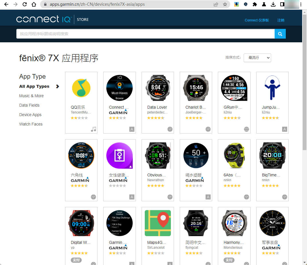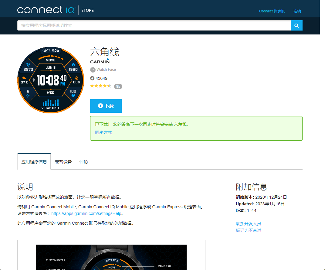 - 这个connect IQ应用商店有可以登录的网页版,可以像Apple的App Store、谷歌的Play Store一样点击下载,在手表下次同步时就会自动安装(如果是表盘,会在同步完后点亮屏幕背光时自动换上),电脑的屏幕比手机可大多了,尤其适合刚开始用手表的新用户在前期大量安装尝试各种表盘、小程序,最终找到自己满意的