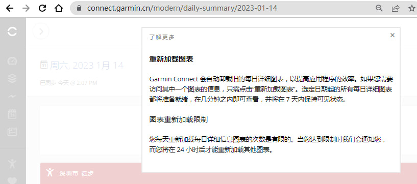 Garmin Connect 会自动卸载旧的每日详细图表,以提高应用程序的效率。如果您需要访问其中一个图表的信息,只需点击“重新加载图表”。选定日期起的所有每日详细图表都将准备就绪,在几分钟之内即可查看,并将在 7 天内保持可见状态。