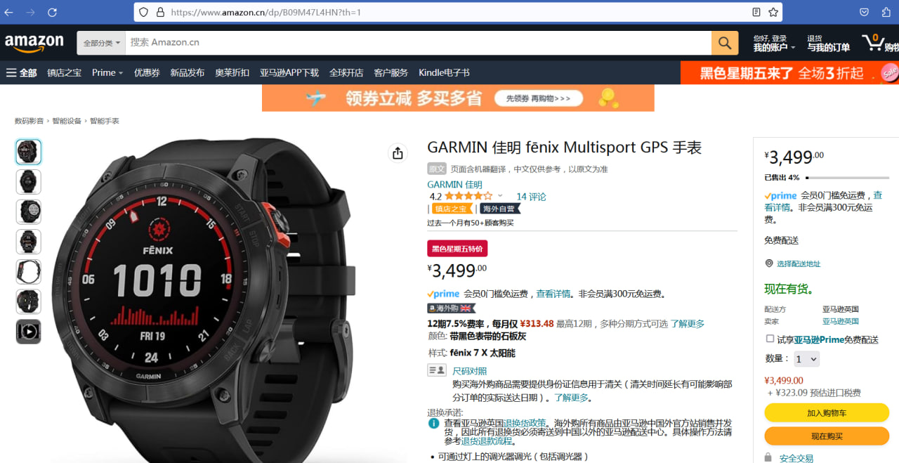 2023年的黑五促销周,中亚网站fenix 7x太阳能版的秒杀价格3,499人民币,加上进口税323.09,合计3,822.09人民币到手,英国亚马逊自营发货,是不错的入手时机!