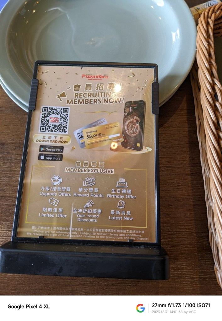最终就近找了一家叫【Pizza maru】的餐厅解决午饭,虽然不是第一次来香港,也不是第一次在香港餐厅用餐,但是这次还是体验到了香港的多语言生活环境,在门口柜台我用普通话询问是否还有位置,店员是东南亚面孔的女士,她用英语问我“2 people?”,好在平时还有时不时的听一些英语内容的视听节目,马上回答她“yes”,她就把我们引入了餐厅的一个双人位。