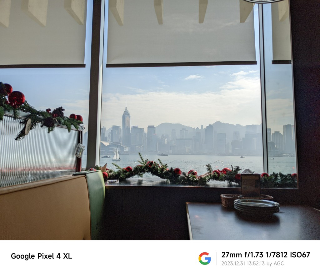 服务员安排的座位旁边就是一个四人位的靠窗卡座,我用英语就询问服务员是否可以选它,服务员就说不行,it’s for 4 people,于是只能说ok然后按安排的入座,还好我们用餐的大部分时间这个四人位都没有人入座,所以还是可以看看窗外的维港和会展中心及湾仔的风光。