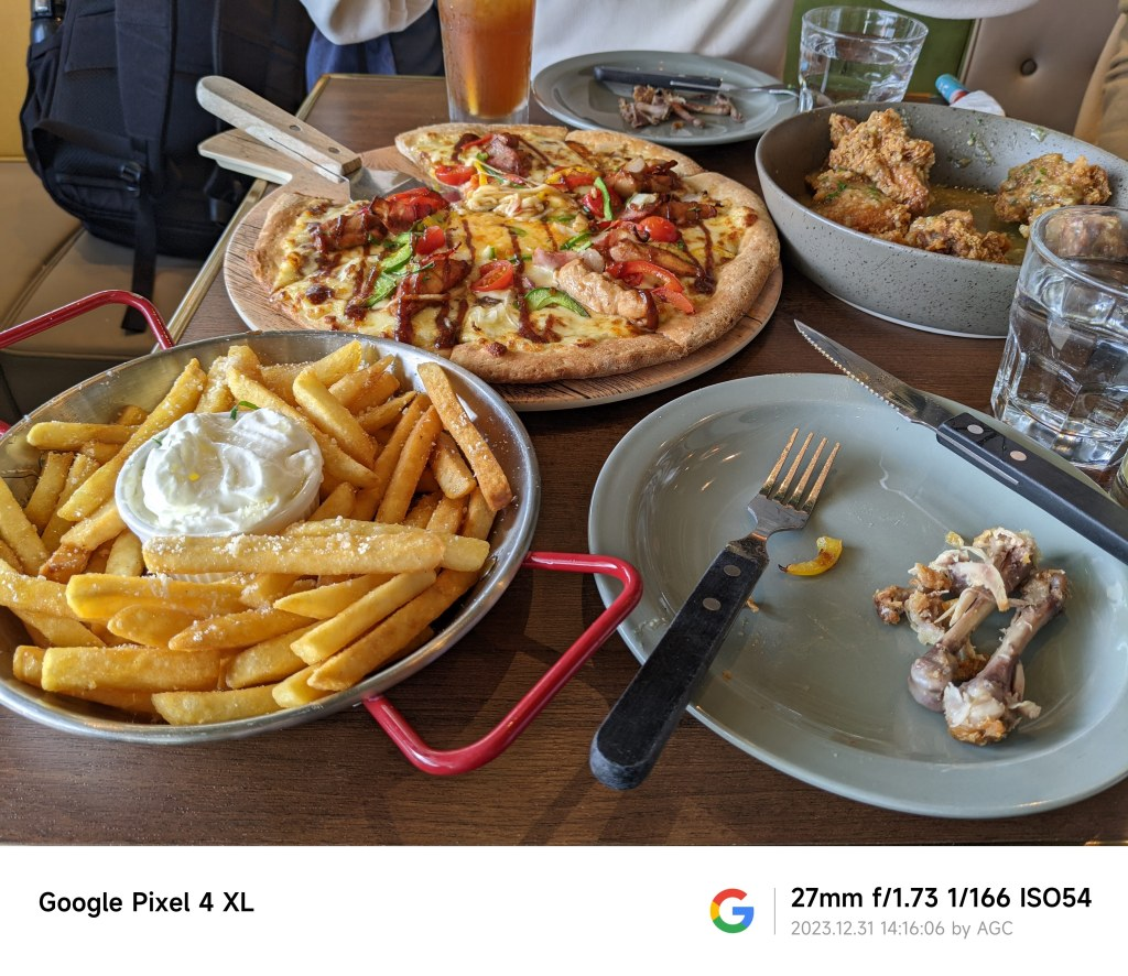 入座后服务员就放了一本菜谱和一本酒水单以及各上了一杯白开水,看了会儿,我叫招呼服务员,我在过去几分钟听服务员在和顾客对话时用的是英语或者白话(广东话),但是广东话我不会说,就拿着菜谱说I’d like this one and this one并用手指菜单,毕竟菜名比较长,而且服务员非常熟练,我指到的时候她就快速念出了菜名,最终点了2份主食一份薯条和两杯饮料,上菜倒是挺快,然后就傻眼了,明显我点的分量多了……