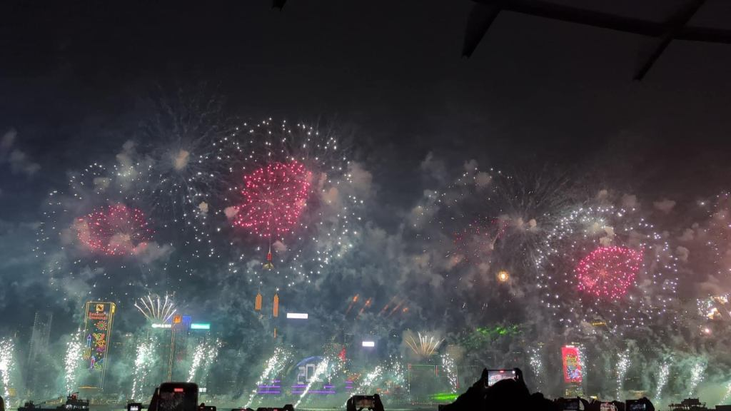 接近凌晨12点时,大屏幕会开始一分钟倒计时,在零点时开始发射大规模的烟花,非常璀璨绚丽: