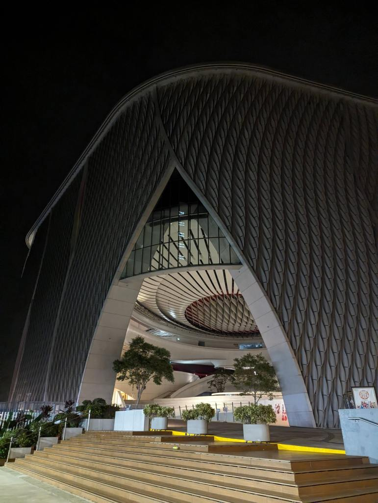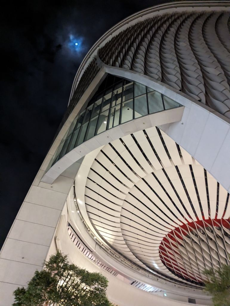 早上5点多,到了中午出来的戏曲中心去坐车,从外面看,就像是一个巨大的舞台帷幕拉开了一角