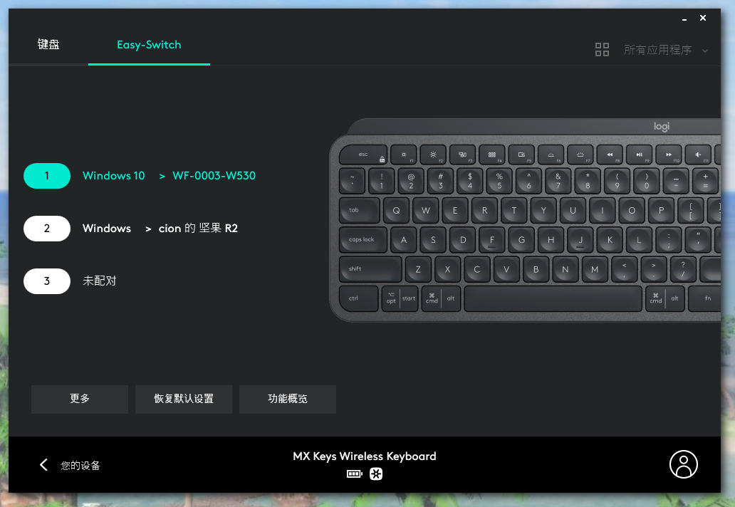 - 多设备切换:MX Keys可以配对3个设备并通过键盘上独立的三个按钮直接切换。从这就可以看出设计MX Keys的人非常看重多设备切换的需求,不是通过单个按键或旋钮,而是提供了3个按键一步直接切到对应设备!