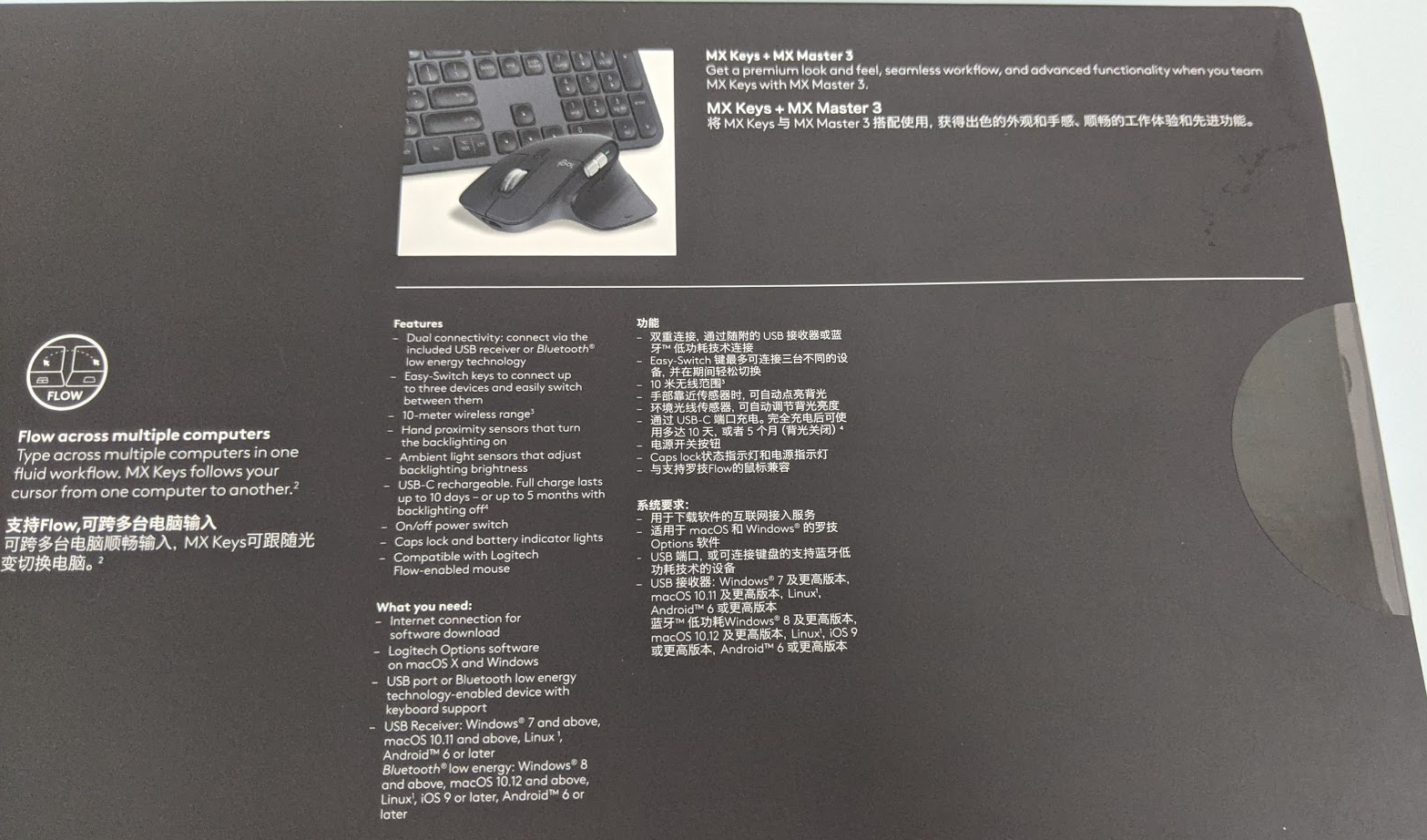 - FLOW跨电脑移动功能:有些显示器多的朋友知道,同一台电脑主机可以使用2台以上显示器扩展桌面的空间,以实现同时处理更多窗口的需要,鼠标是可以跨屏幕移动的,而罗技的FLOW可以让鼠标在同个局域网的两台都安装了罗技软件的电脑的屏幕之间移动,甚至还可以直接跨电脑实现复制和粘贴文字、文件。而且如果与MX Master 3鼠标搭配使用,还可以鼠标移动到另一台电脑就会自动让MX Keys键盘也连接到那台电脑。