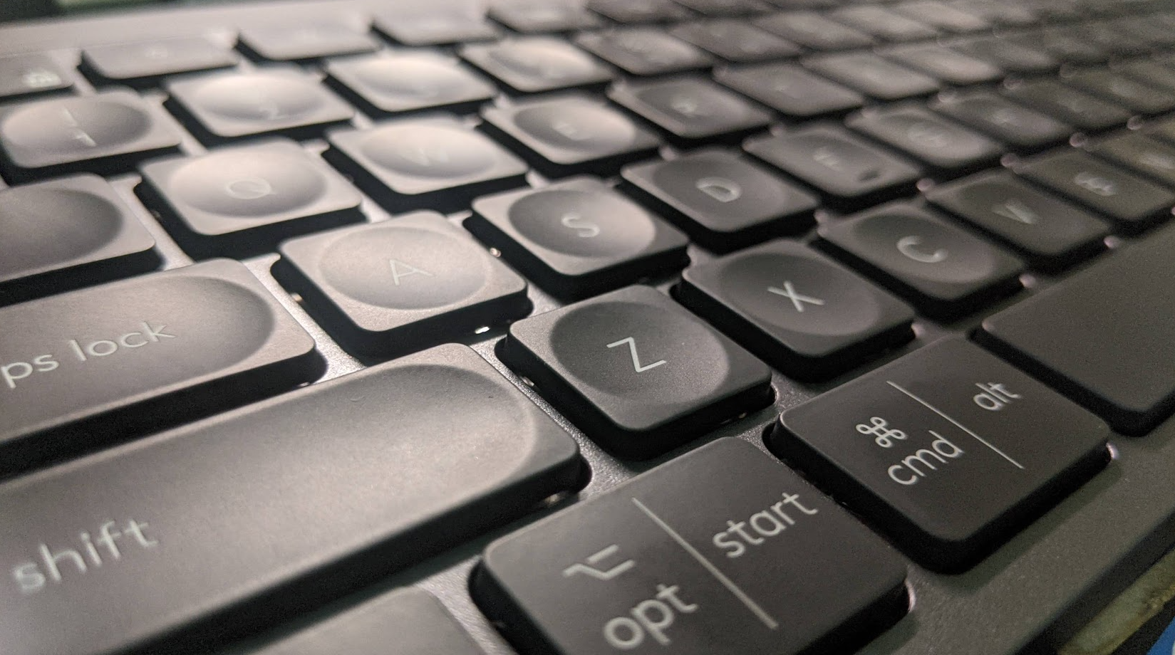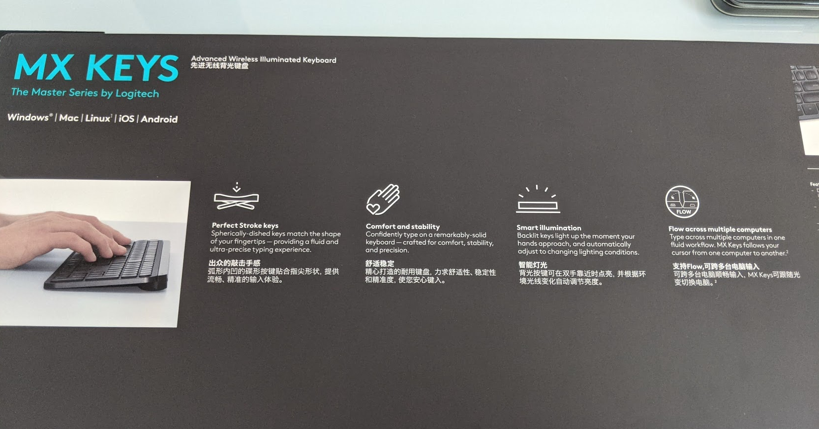 - 手靠近键盘自动点亮背光:大概是内置了距离传感器,当手靠近MX Keys的下半部分尤其是ADSF一排按键,还不用触碰到按键,键盘的背光就会亮起,要在光线昏暗的休息时间使用键盘时,作用就会体现出来,也就是说你再也不用在灯光不足的时候为了点亮键盘背光而先睁大眼睛找到按键以免按错,这种功能对有些人士还是挺贴心的。背光可以手动关闭或调整亮度,在内置电池电量不足的时候,背光会自动关闭。