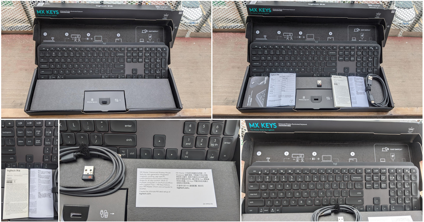 - 两种连接方式:MX Keys键盘有两种连接主设备的方式:USB口的优联适配器,蓝牙,经过测试都可以使用,一般我是把USB适配器插在电脑上,而手机或者不方便连接USB的设备例如手机,则通过蓝牙链接,这两种方式连接上后,键盘就可以直接使用了,而USB适配器的方式是最快捷的,因为插上就能用了,而且罗技的优联适配器经过简单匹配设置,可以同时连接自家的所有可以使用优联适配器的键盘鼠标,这就可以节约电脑有限的USB接口了,特别是像我这样好几个罗技无线键鼠的。