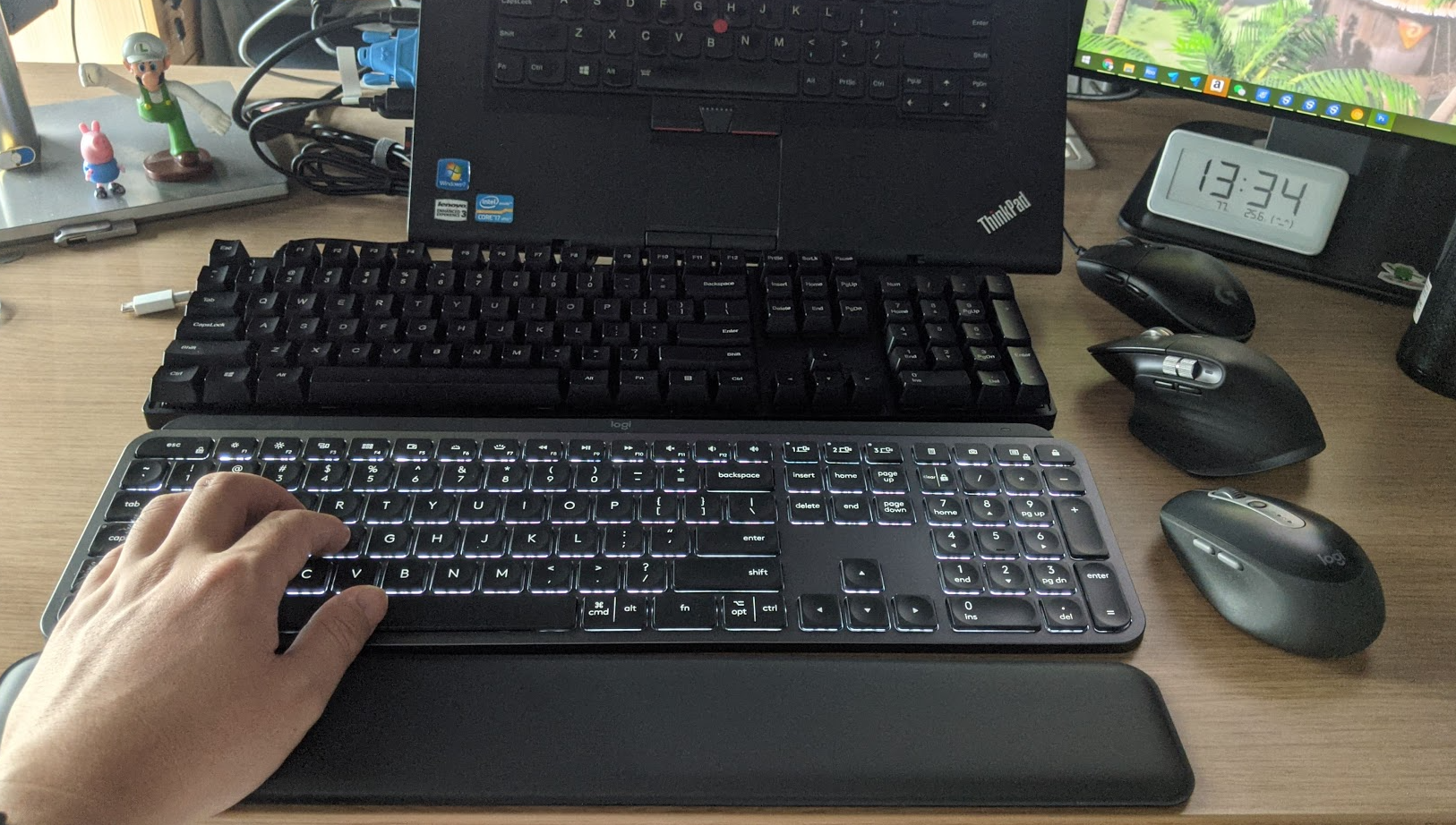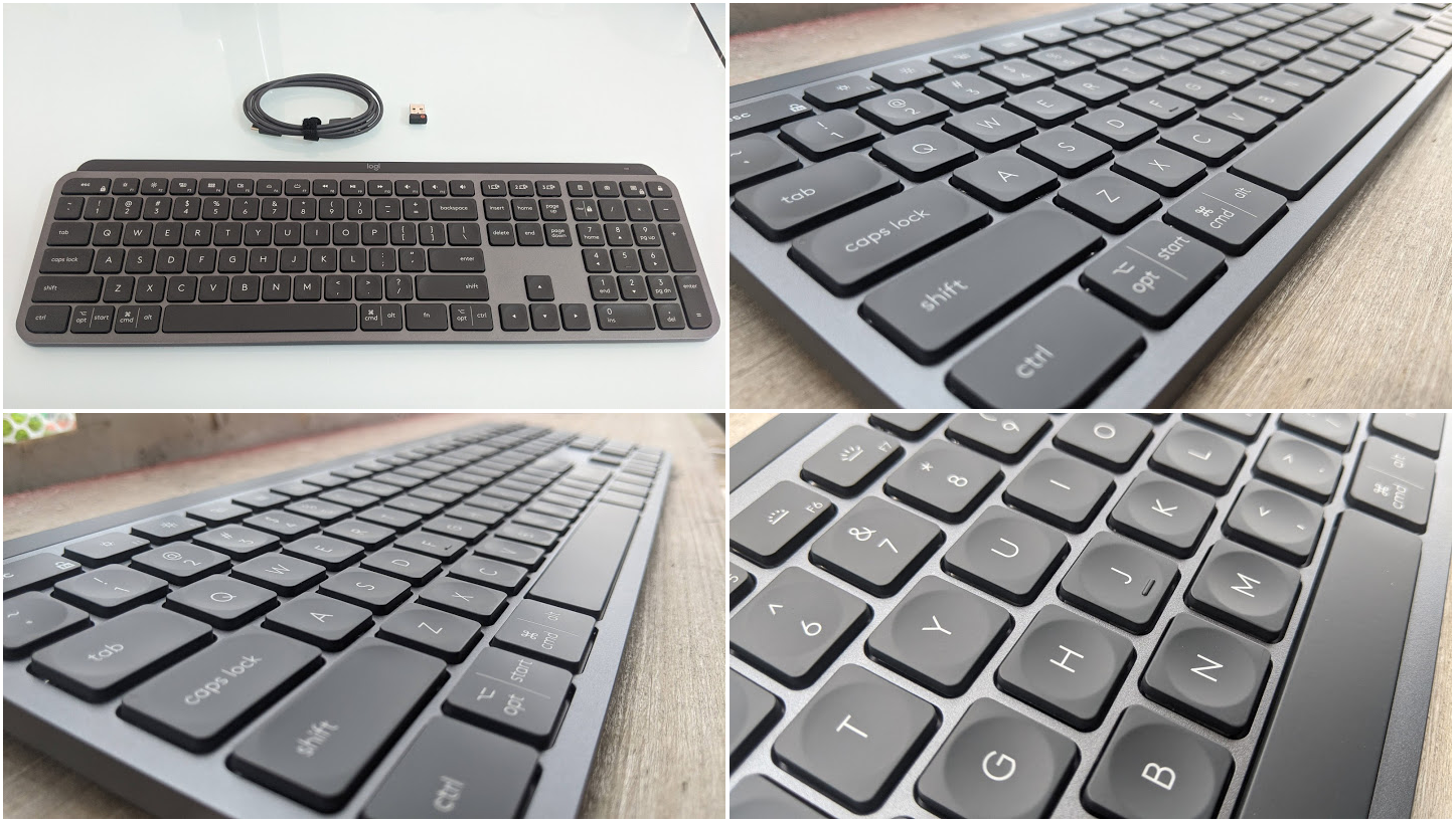 - 安静:对我来说这个键盘最大的卖点就是静音,也是我咬牙剁手高价买它的首要原因,我对静音的要求高,事实上这也不是我的第一块静音键盘了,实际使用也确实是我用过的手感不太差的键盘里面最安静的了,我也有已经吃灰的罗技的K400+无线键盘,它按键手感非常差,打字像极了一些地板砖没铺踏实的人行道下雨后方形地板砖踩上去摇摇晃晃的拉跨,但是这个MX Keys不错,加上每个按键都有比较贴合手指的指肚的凹槽,总体的体验不错,实测即使在午休和半夜时间大量打字,也可以不吵到他人休息,手感和安静程度接近ThinkPad的笔记本键盘(我自己有两台ThinkPad,而且公司办公用也是ThinkPad)。