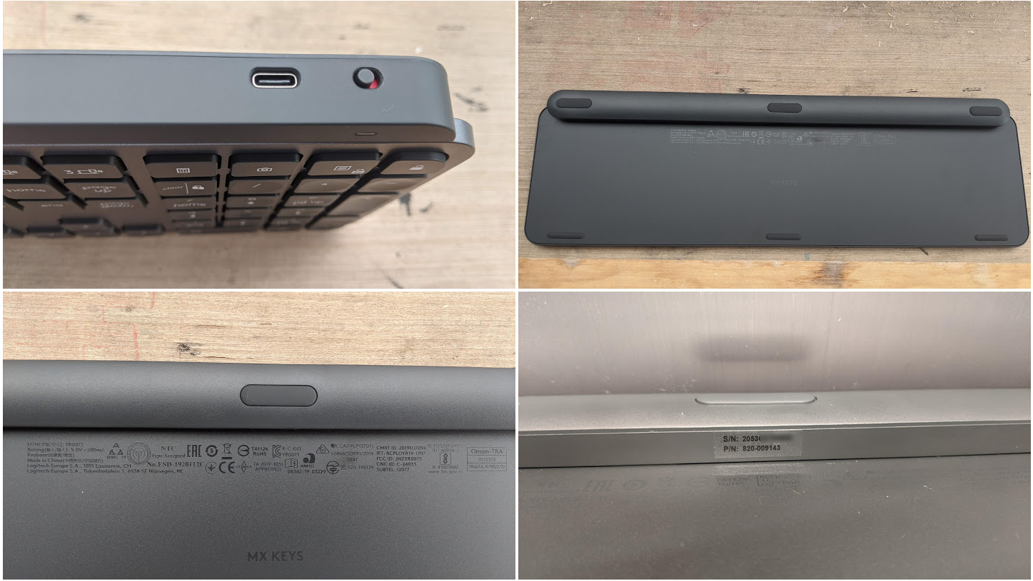 - 底部没有调节高度的支架。在用这个键盘之前我用了3年多的几十块钱的罗技K120普通办公键盘,虽然按键手感不如MX Keys,但是在不调节升降桌的情况下,我用MX Keys不到一个多小时就出现了手指酸痛的感觉,要知道很多几十块钱的普通键盘都有调节支架,比如自家的K120,这让我考虑要退掉这个MX Keys的重要因素之一。