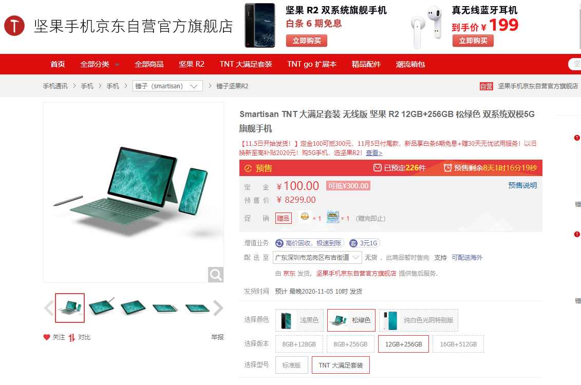 (2)TNT大满足套装无线版,含松绿色R2 12GB+256GB和TNT go ,当前售价8299,预付定金100可抵300,实际7999(检查日期2020-10-28)