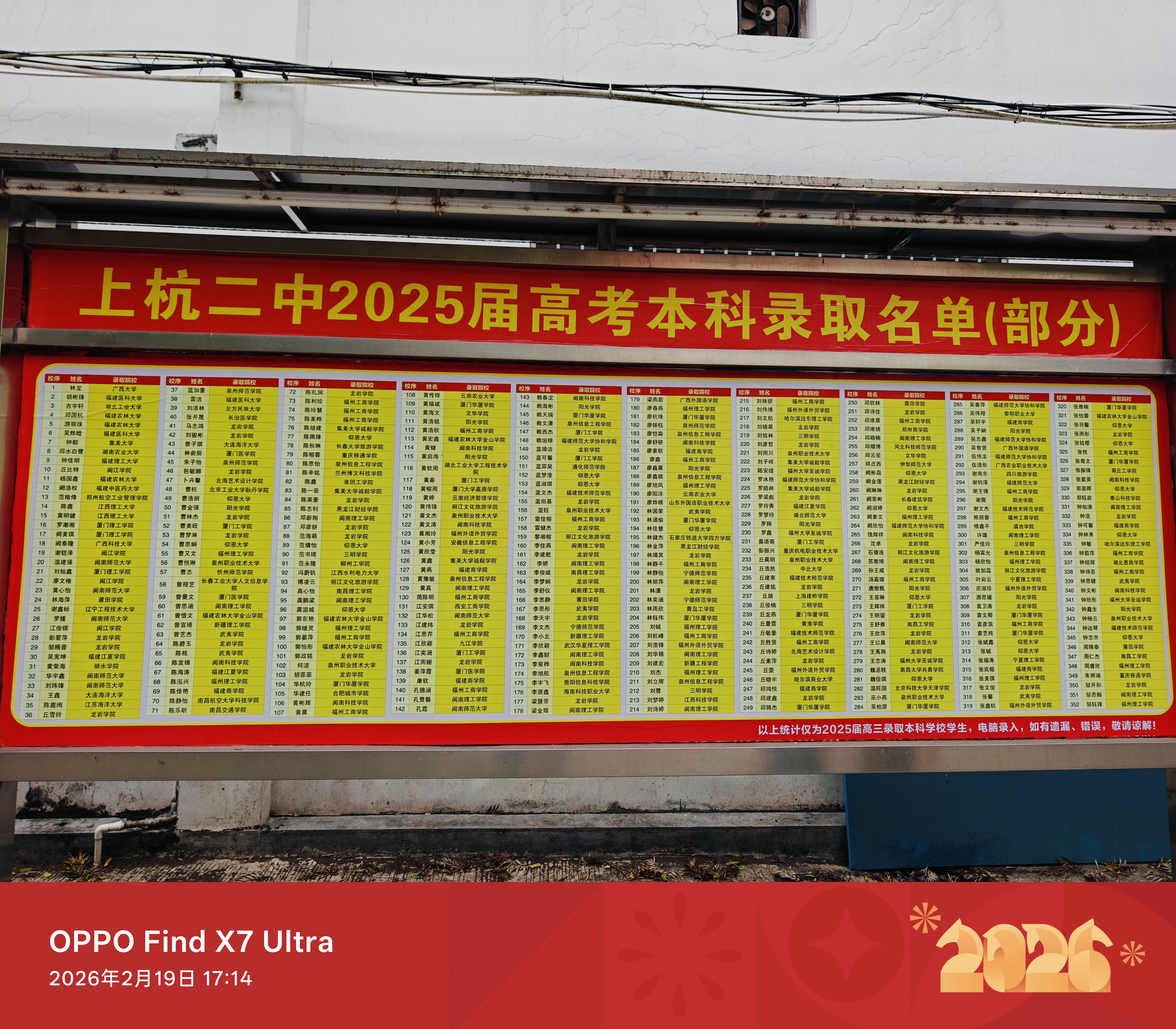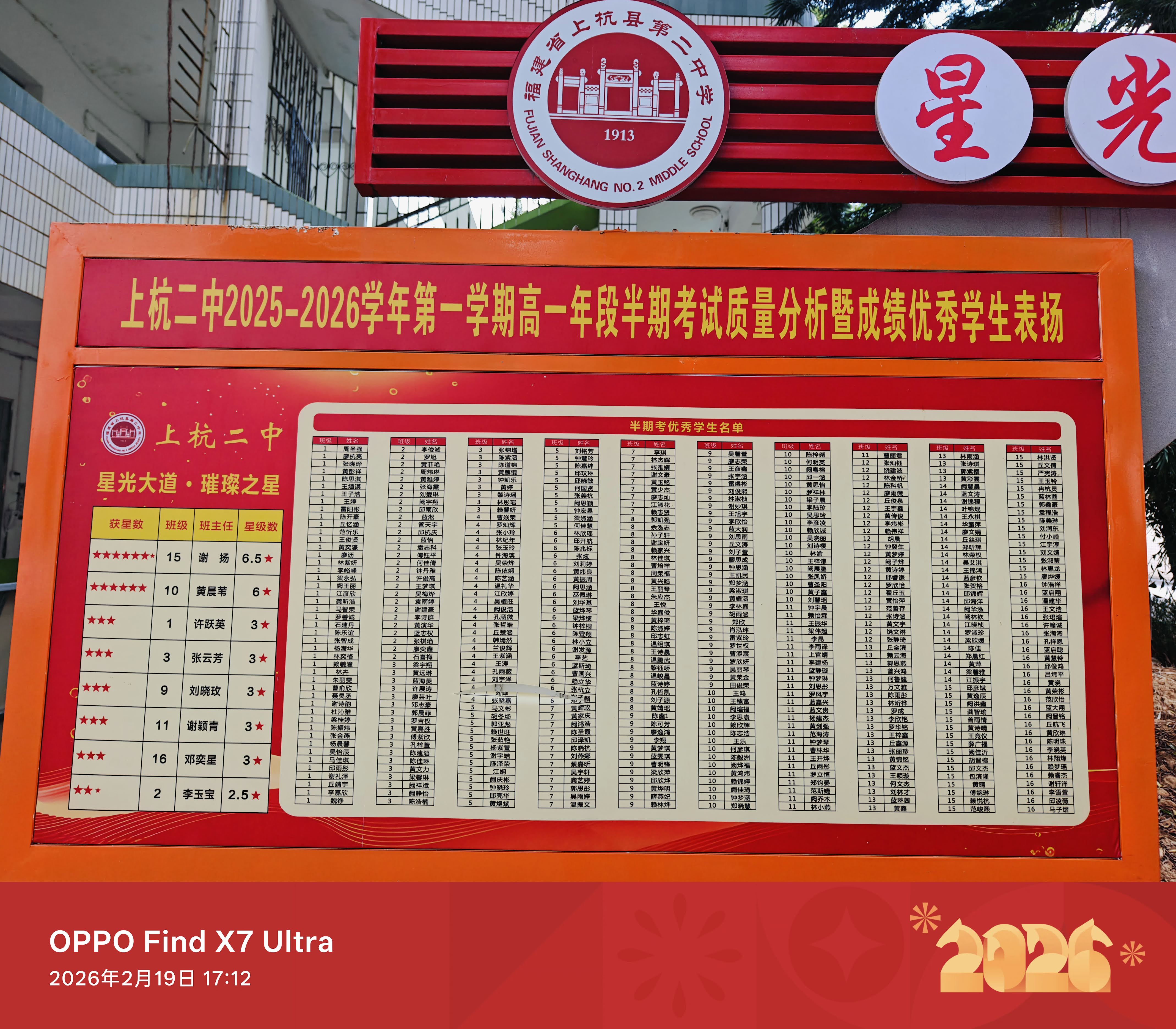 宣传栏上的现在高一优秀学生榜(2025~2026学年第一学期)