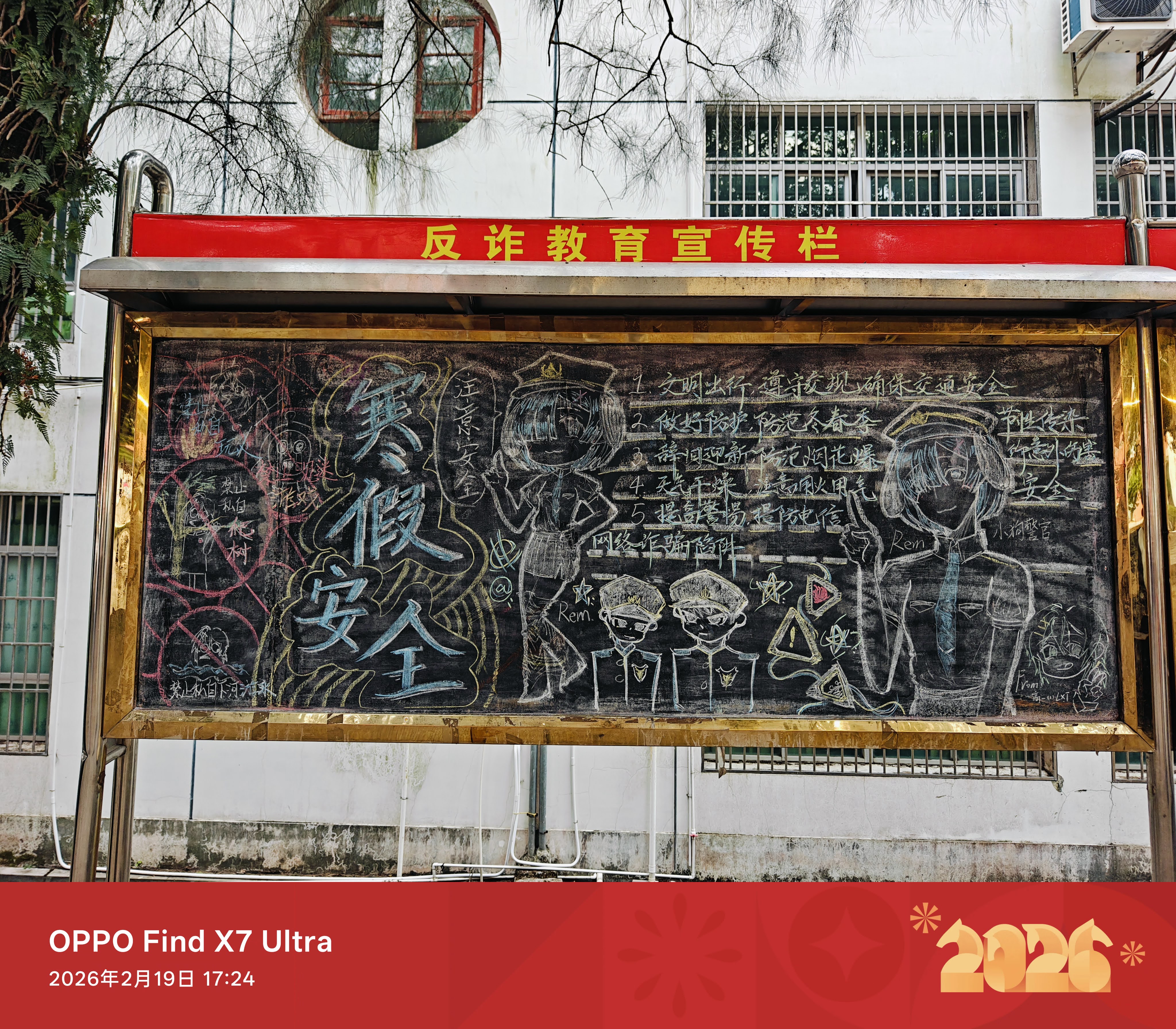 在前往体育馆的路上,高一教学楼背后的宣传栏引起了我的注意,黑板上是寒假安全主题的内容,用彩色粉笔书写,还有大大小小多个动漫形象,学校和老师能接受学生们的动漫文化,真替学弟学妹们感到高兴,也佩服校方的宽广胸襟: