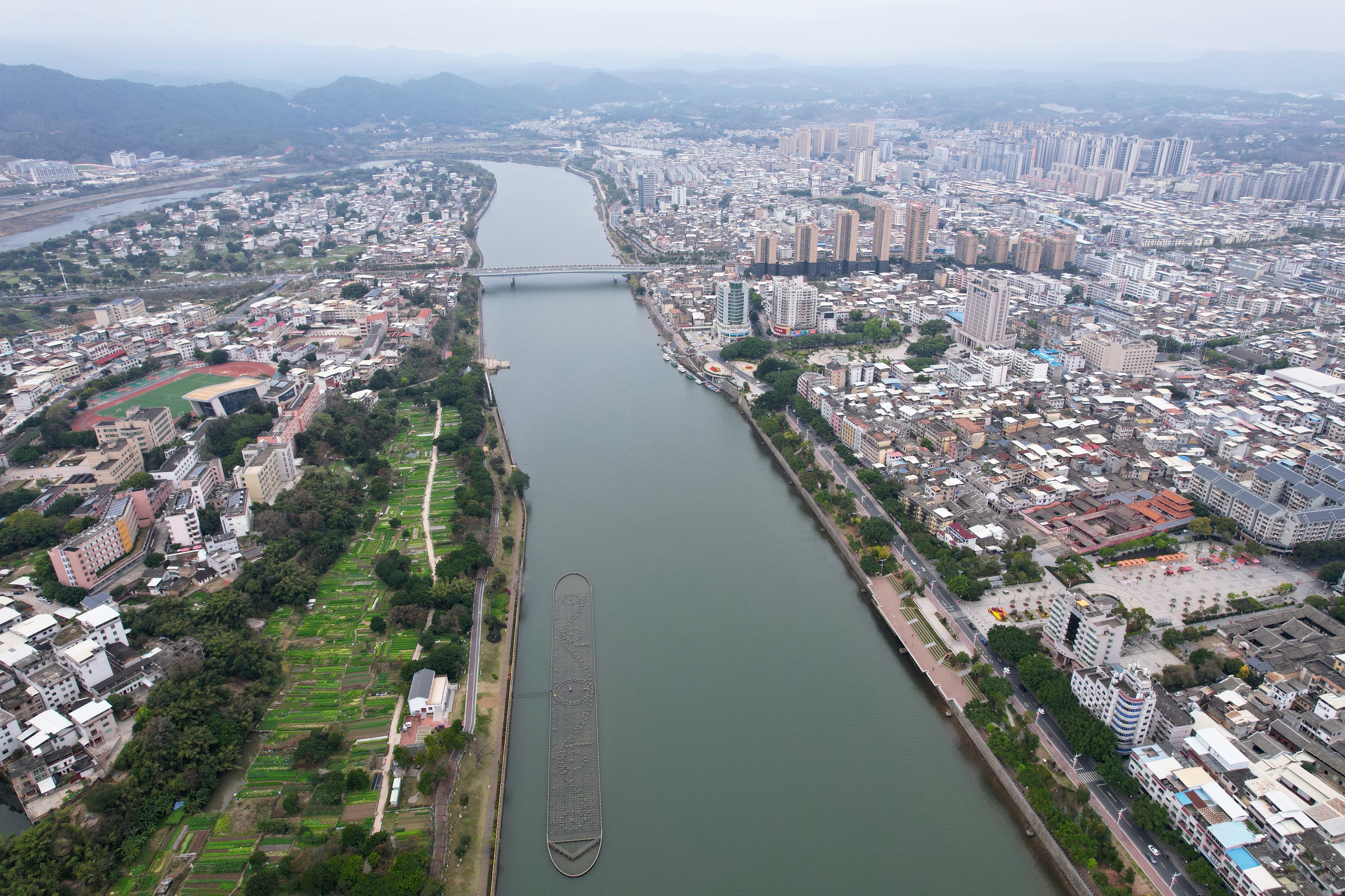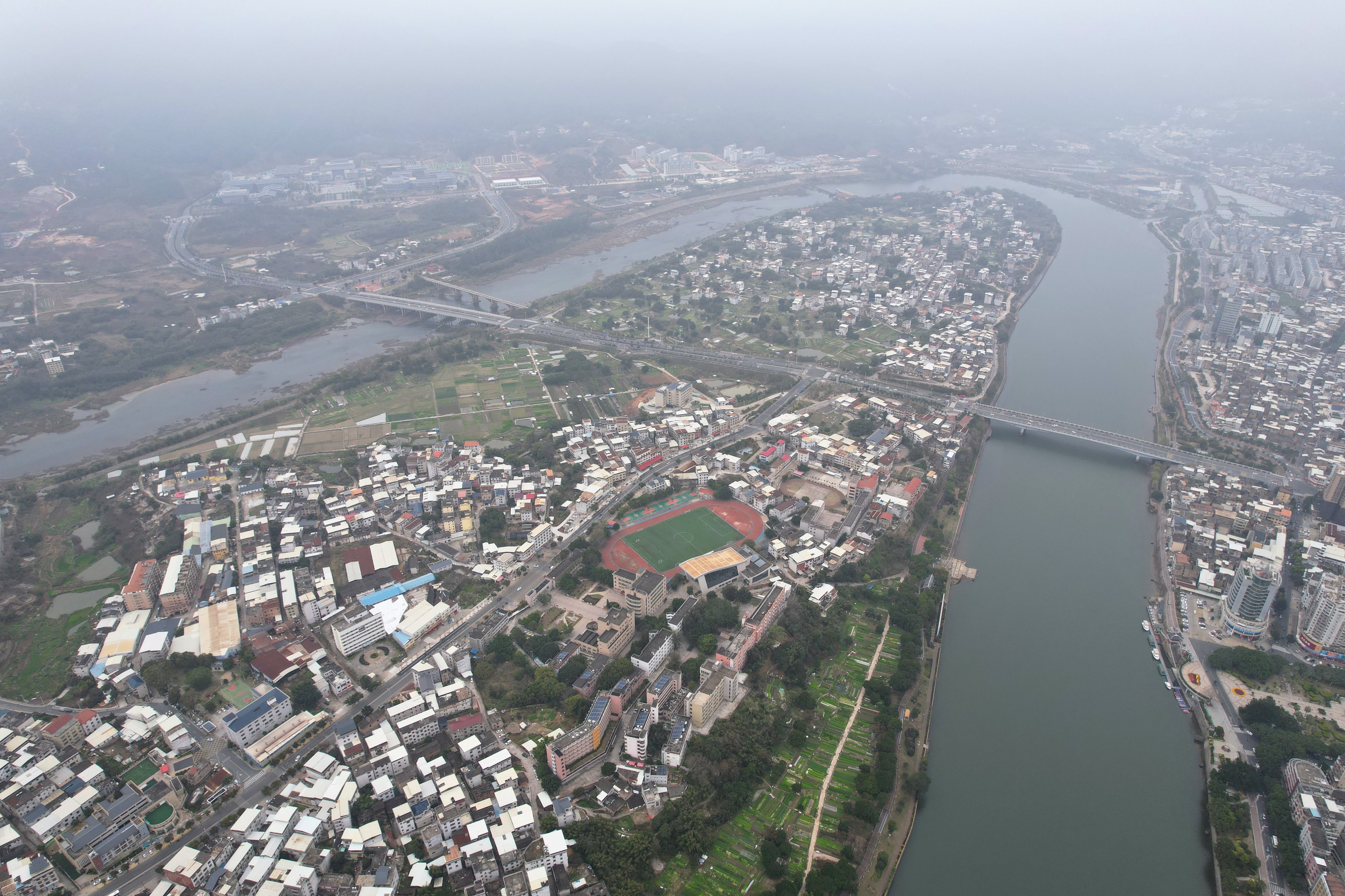 某同学从大桥上拍摄的汀江,右边岸上微露红色的建筑就是二中教学楼,高三时能从窗外眺望自东向西流过的汀江和对岸的县城人民广场和城区,以及甚至远处的紫金山矿山,风景非常哇塞!
