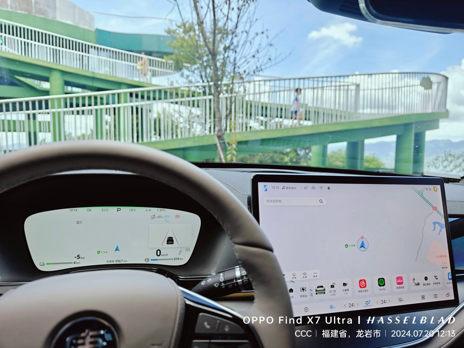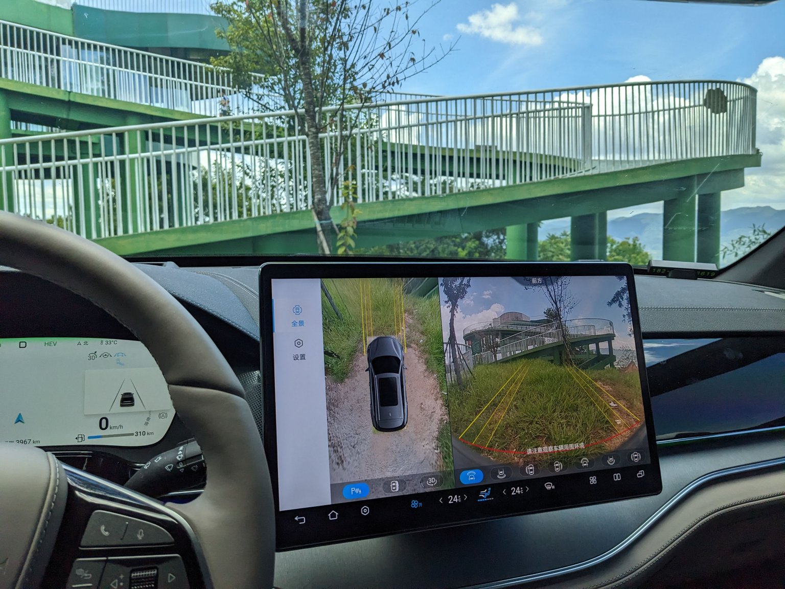 - 阳光透过树叶间隙照射下来,对司机的视线有明显的干扰,有时候一阵风吹过,树叶缝隙突然拉大,顿时晴天的强烈阳光就晃眼了,不得不经常眯着眼,减少眼睛的进光量,好在车机的中控屏有360度周遭影像,可以在挡风玻璃视线受干扰时看屏幕应付下保持车道