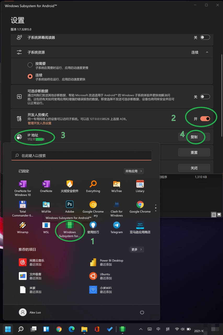执行第一项,几分钟后就安装完成,然后进入开始菜单点击打开刚安装的Windows Subsystem for Android: