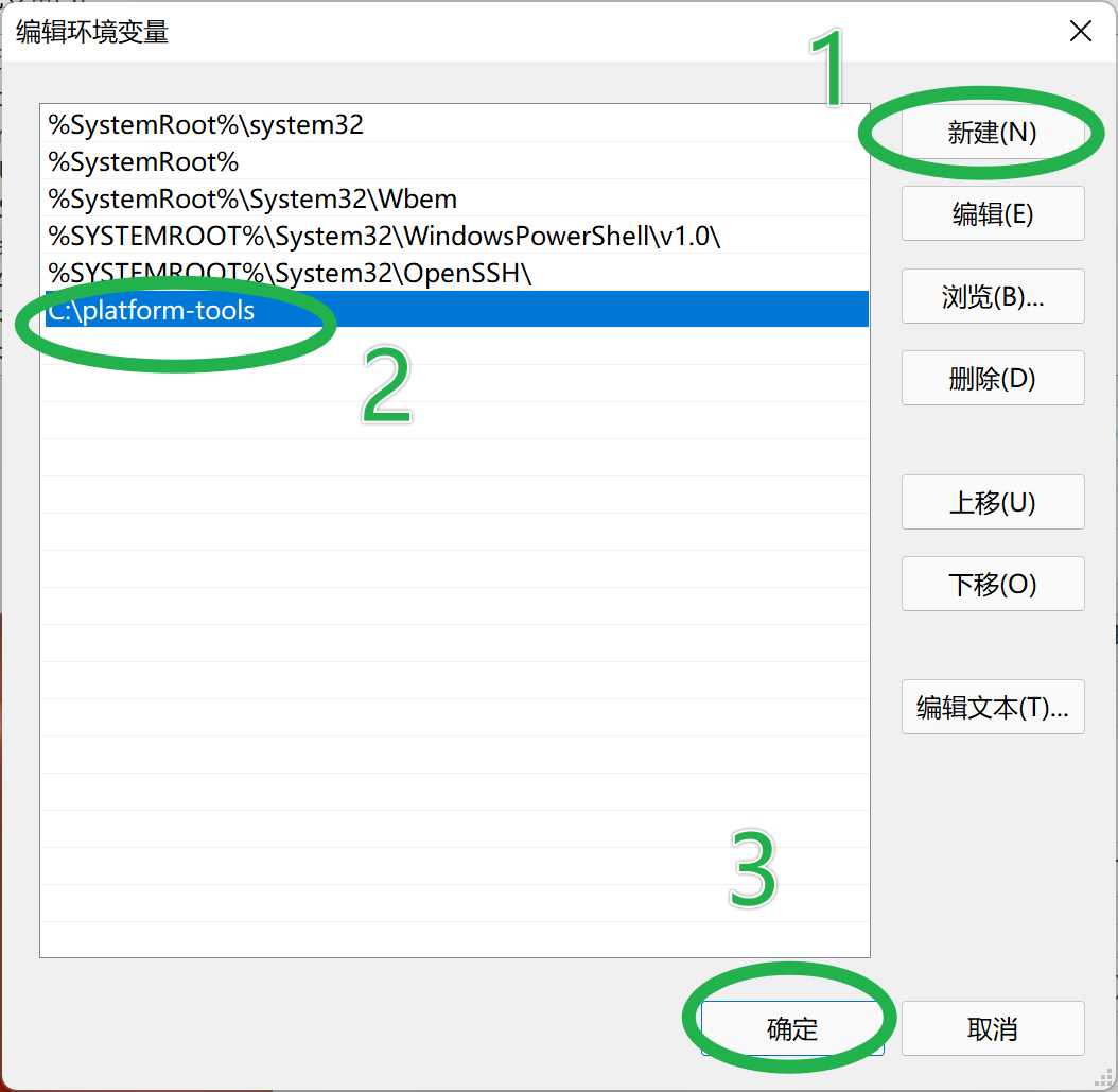 在弹出的【编辑环境变量】窗口中,点击右侧的【新建】,在左侧的列表最下面会出现一条输入框,输入之前步骤中的platform tools的路径,也就是 C:\platform-tools (具体以你自己实际的路径为准,切勿照搬),然后点击【确定】保存。这个操作的目的是为了后续运行adb命令更加方便。