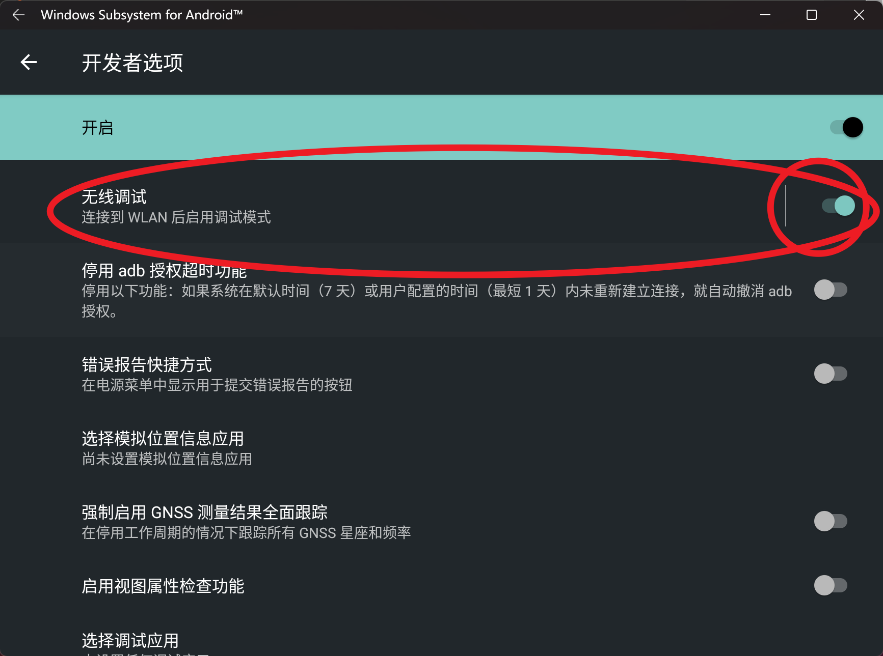 在打开的【开发者选项】里,往下滚动屏幕,可以看到【无线调试】,默认是开启的,现在把它关闭再打开。
