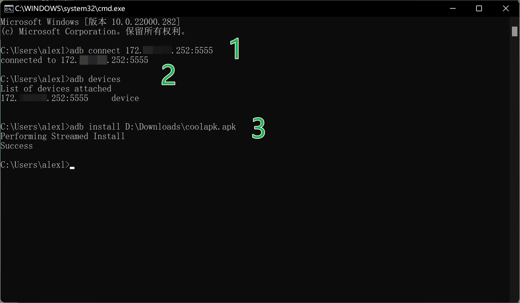 C:\Users\alexl>adb connect 此处替换为步骤5 - 3里复制的IP地址:5555