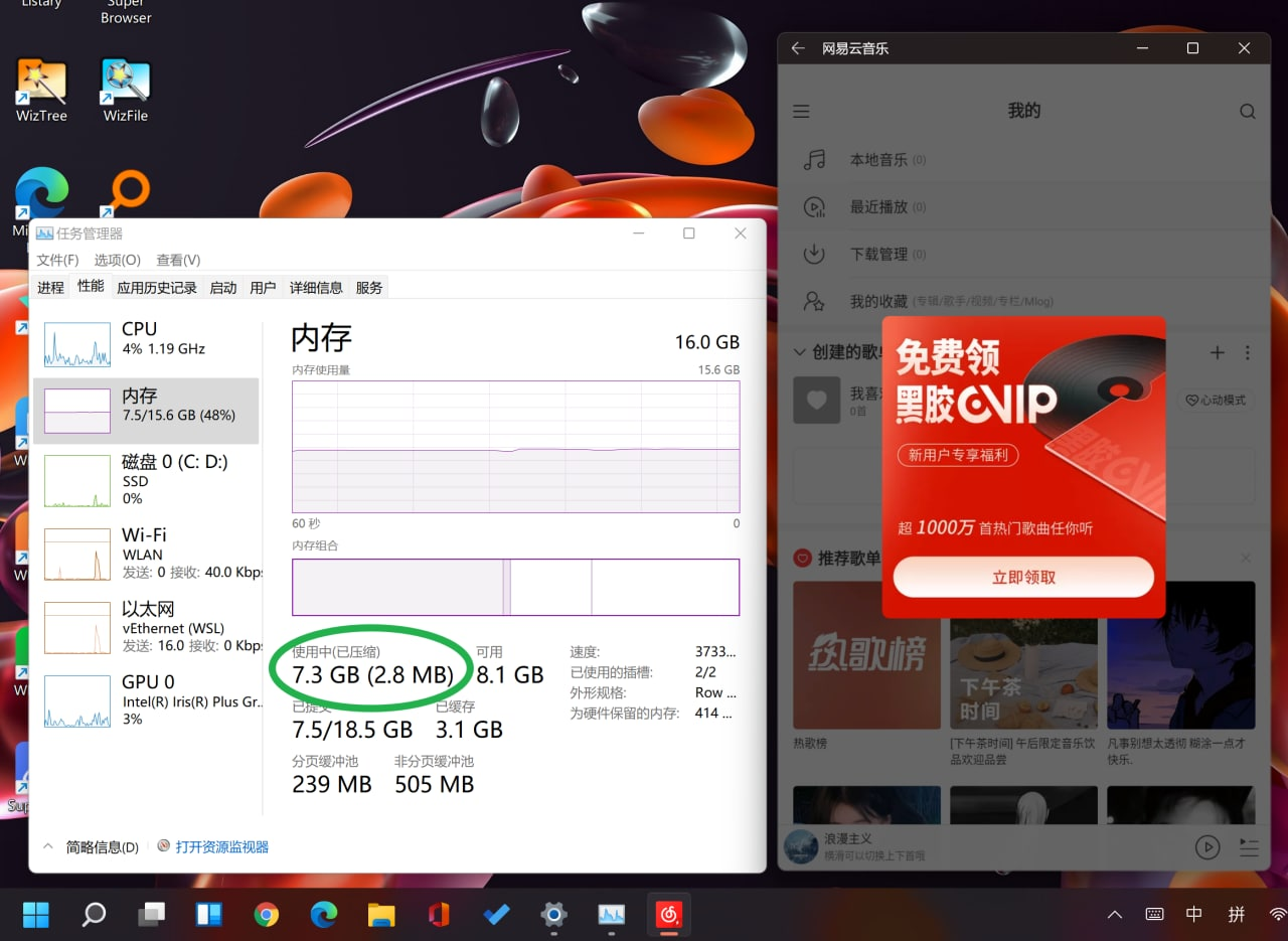实测发现,运行这个子系统和一个网易云音乐极速版,前后的变化: