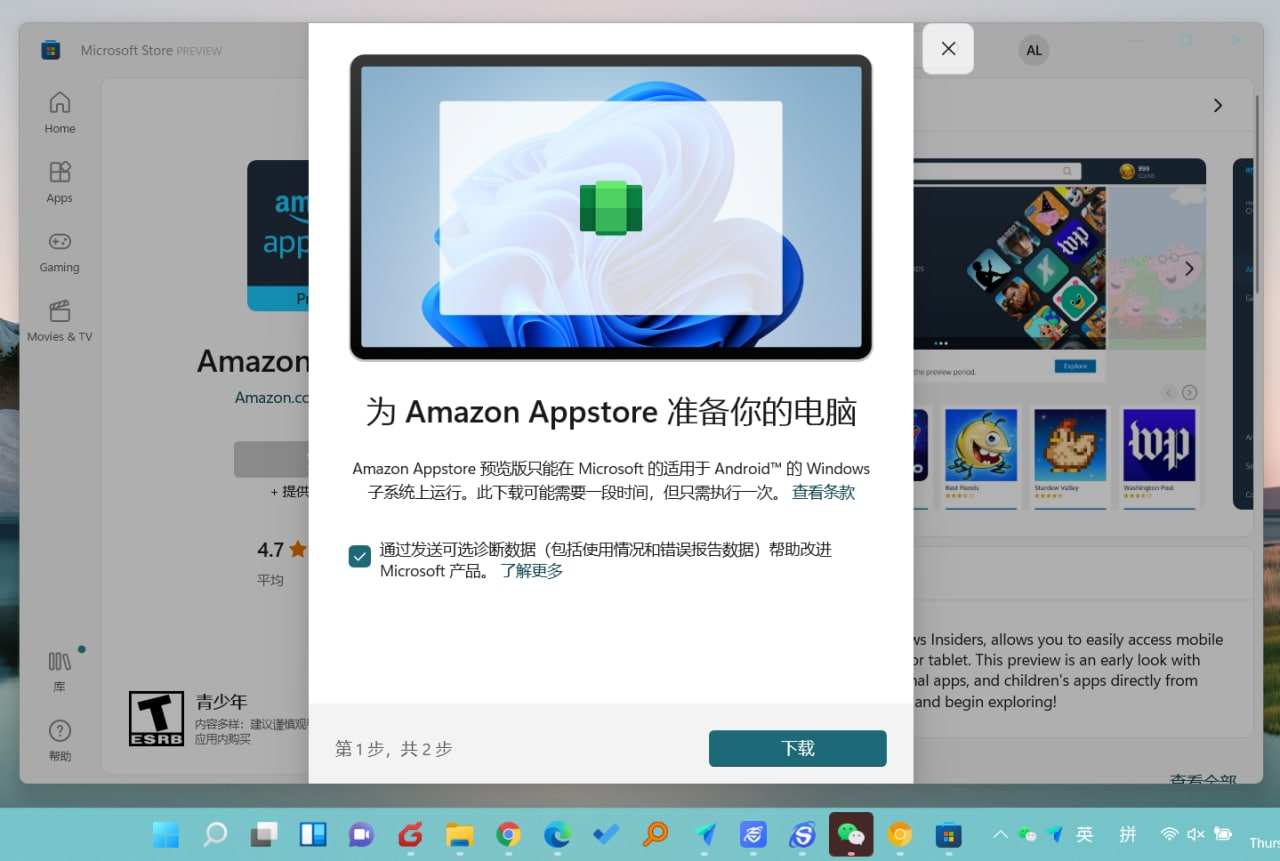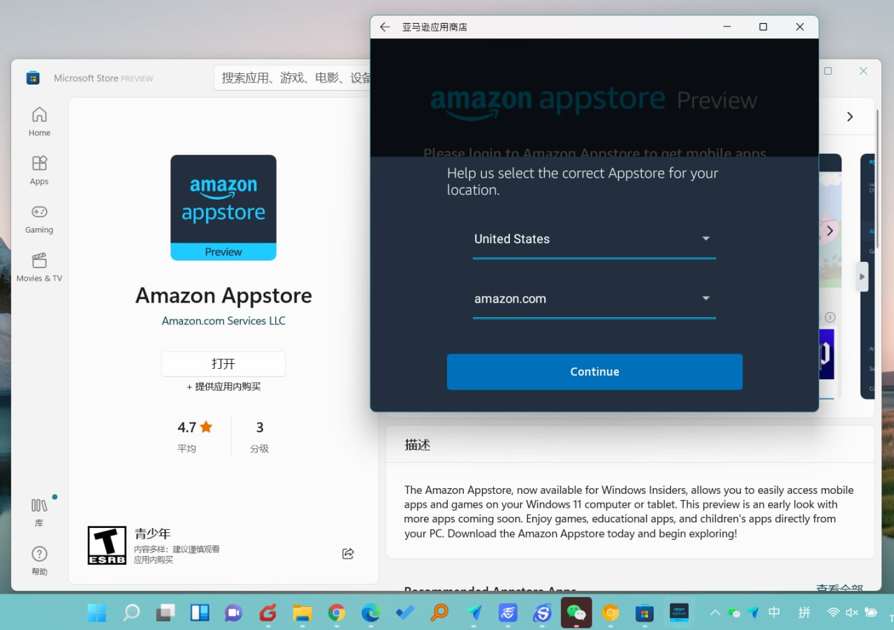 为了给Windows的安卓子系统捧场,微软居然在自己的官方应用商店Microsoft Store上架了另一家互联网巨头亚马逊的安卓应用市场Amazon Appstore,搜索这个应用就会自动开始引导安装WSA,为了方便,微软甚至还提供了一个链接,点击就可以直接跳转打开: