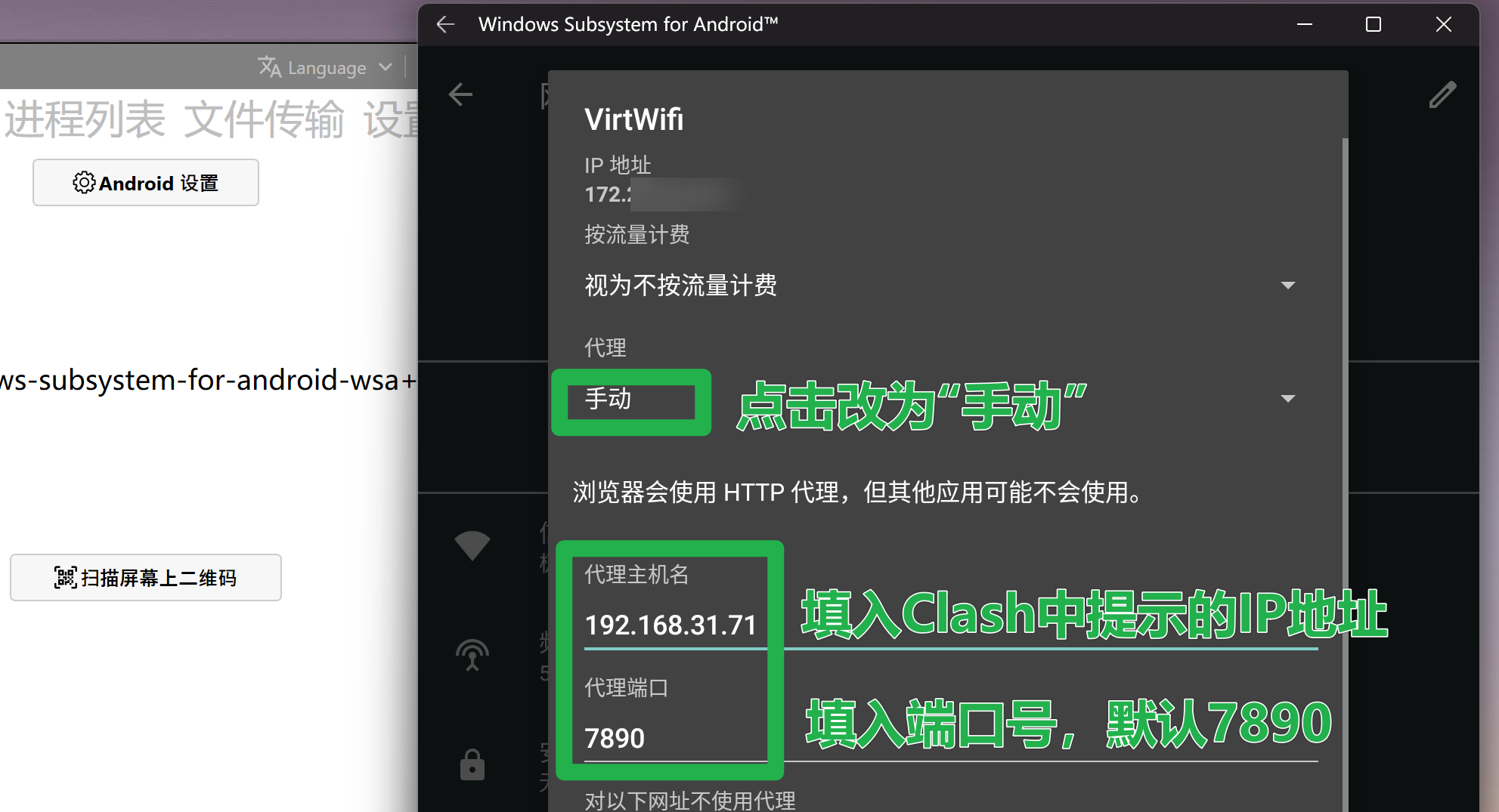 回到刚才的VirtWifi设置界面,把代理设为手动,并在【代理主机名】下填入上一步Clash里浮现的IP地址,注意这个地址可能每台电脑都不一样,不要照搬,【代理端口】填7890,然后确定保存,关闭安卓设置界面