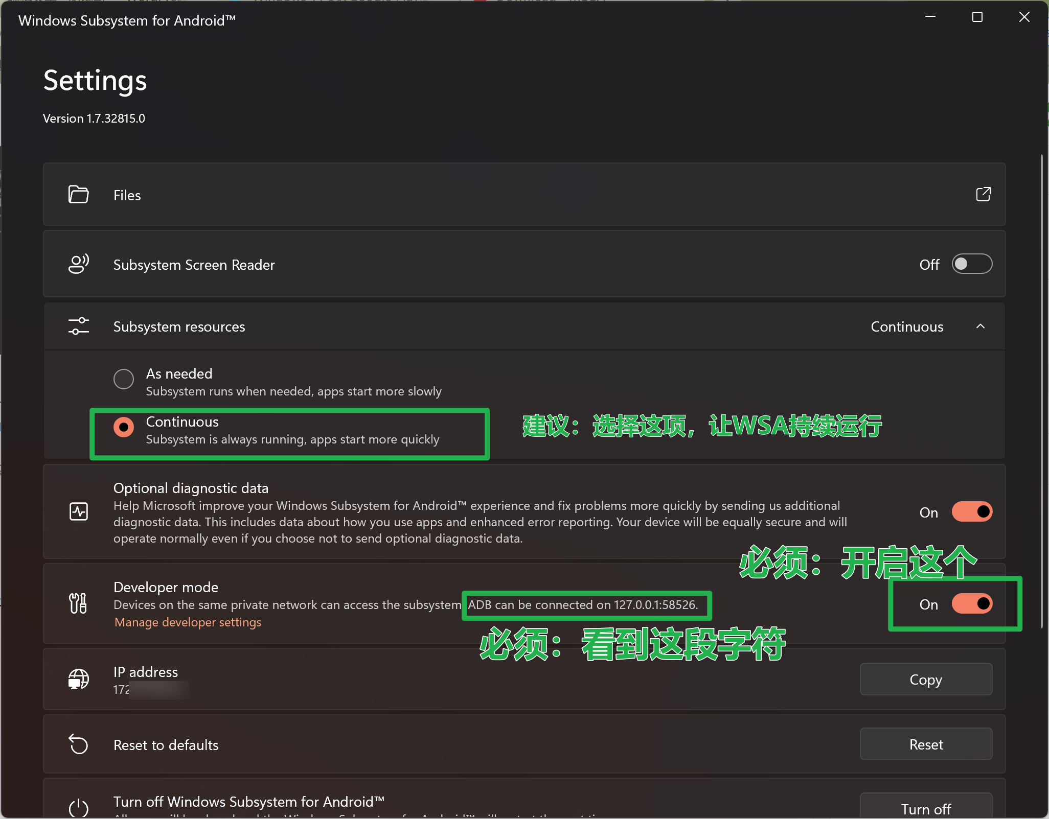 - 建议上面的Subsystem resources选项设为Continuous,也就是一直运行安卓子系统