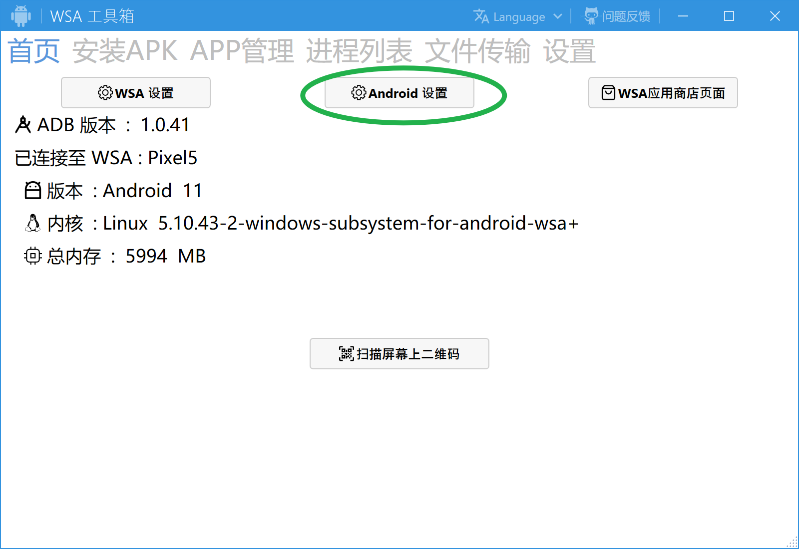 这个工具箱还带了安装apk、管理已安装的app以及传输文件的实用功能,不过现在我们要用到的是它首页的【Android设置】入口,因为正常情况下在WSA里很难找到安卓系统的设置入口