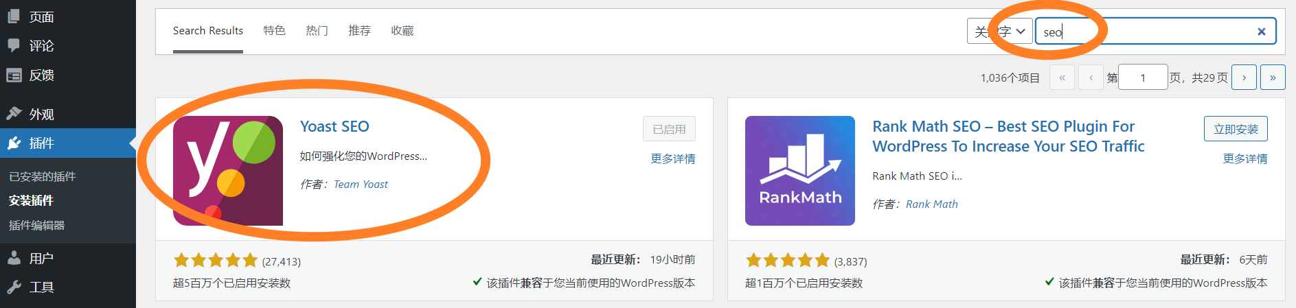 在WordPress后台的【安装插件】页面,搜索seo,即可找到【Yoast SEO】这个插件,简直好评如潮,不用犹豫,点击安装,然后启用它。
